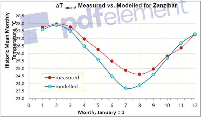 There is inevitably a small discrepancy between historic temperatures as computed, as opposed to ‘as measured’. The computed temperatures are the median of the model ensemble outputs, as averaged over the entire grid cell. The measured temperatures are for the specific location, in this case Zanzibar airport. These monthly discrepancies are shown in Figure 1, below. For the purposes of climate change this mean discrepancy, the ‘bias correction’, is taken as 0.4°C. That is, for climatic projections, Tfinal = Tmodelled +0.4.