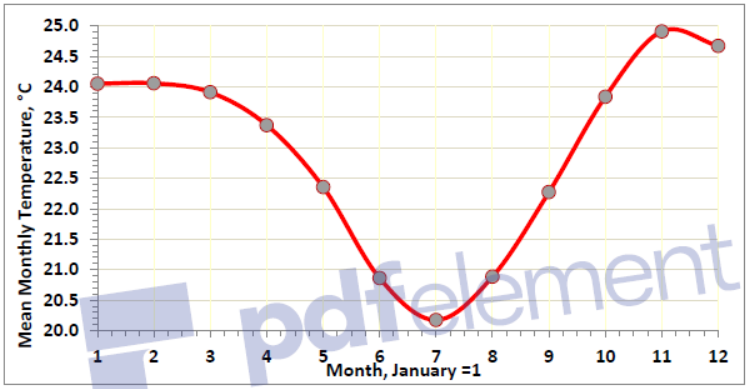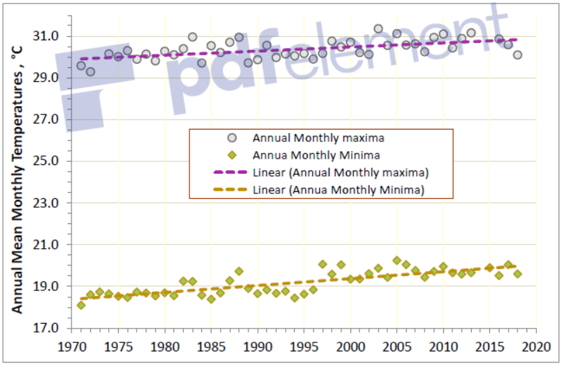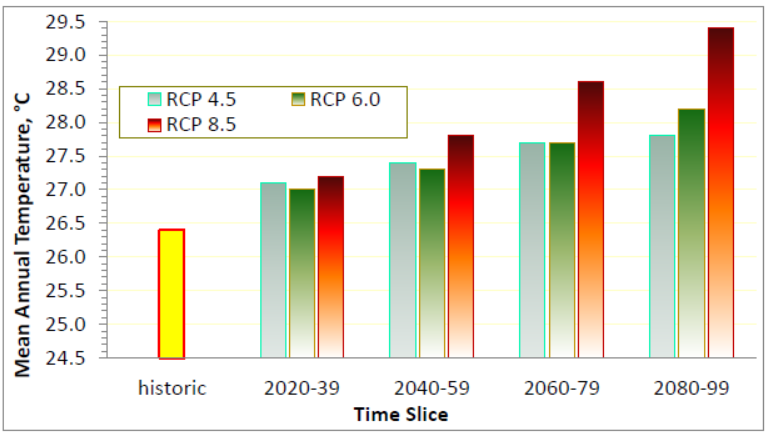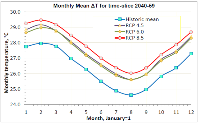 Projected temperatures are modelled on a mean monthly basis, shown in Figure 4, for 2050 and 2090, and for RCPs 4.5, 6.0 and the worst case 8.5. The most likely increase of about 1.5°C, relative to recent historic temperatures, is about normal for a tropical to sub-tropical environment.
