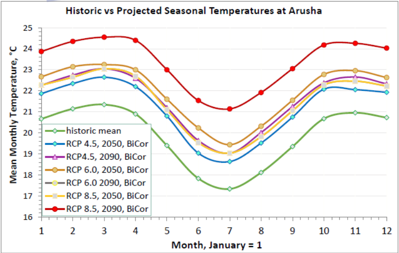Figure 4: Seasonal Temperatures at Arusha: Historic vs. Projected